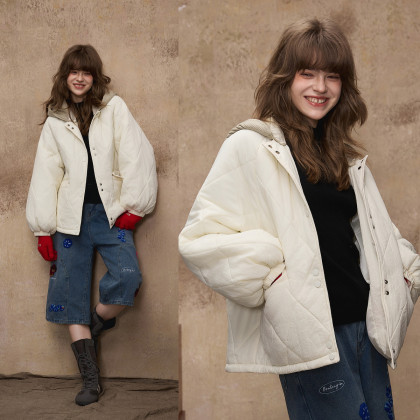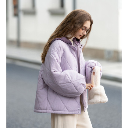 唐狮冬季新款连帽棉衣女外套夹棉假两件短款百搭菱形格棉袄