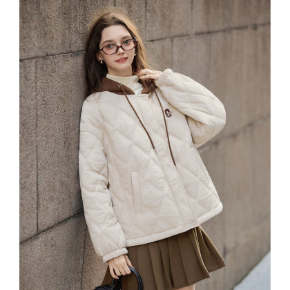 唐狮2026秋冬季女士拼接撞色连帽短款棉衣菱形格时尚百搭设计感
