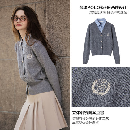 唐狮2026秋季毛衣女外穿翻领条纹衬衫假两件开衫毛线衫设计学院风