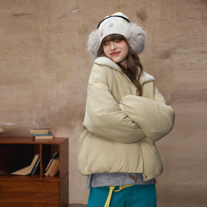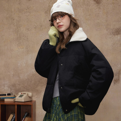 唐狮2026冬季短款棉衣女翻领仿羔毛拼接高级感慵懒风时尚韩系穿搭