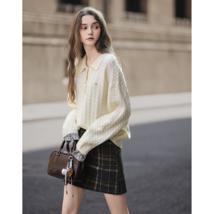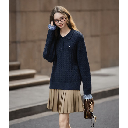唐狮2025秋冬季女POLO领净色绞花袖口拼接假两件毛线衫超好看上衣