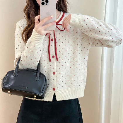唐狮2026秋冬女圆领撞色钮扣满地提花开衫毛线衫百搭女毛衣韩系