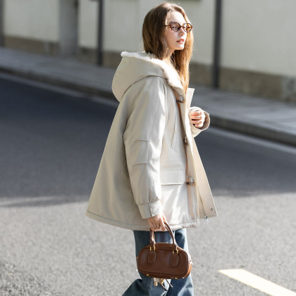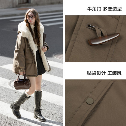 唐狮2026秋冬季短款棉衣女仿羊羔毛拼接连帽腰部抽绳收腰设计时尚