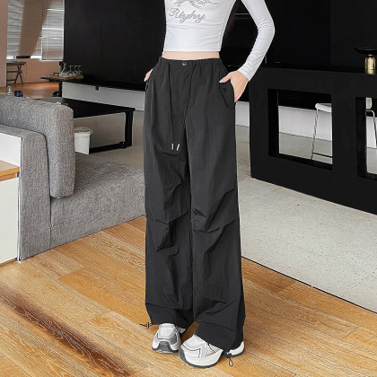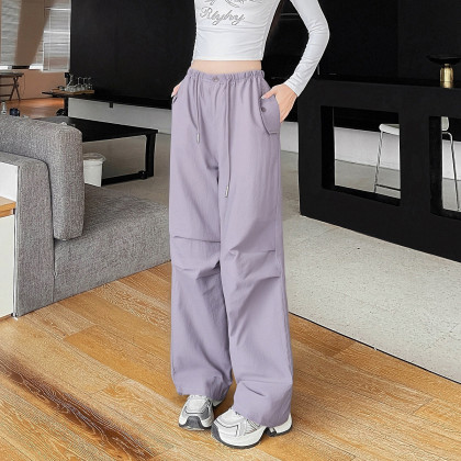 唐狮女宽松休闲净色褶皱尼龙长裤