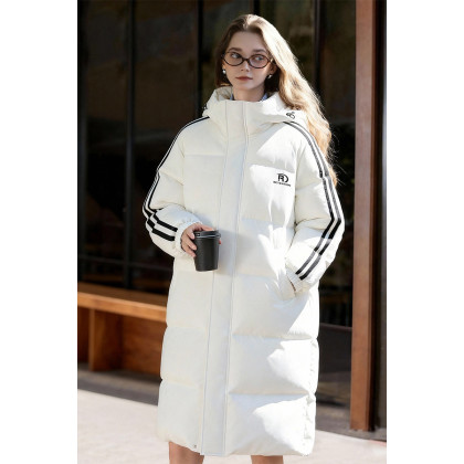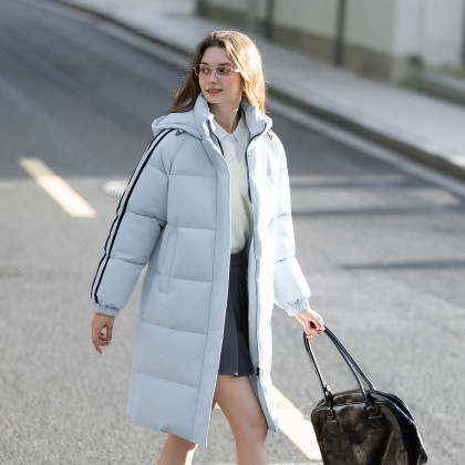 唐狮2025冬季长款棉衣女淡蓝色连帽撞色织带加厚保暖美式学院风