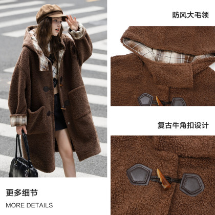 唐狮2026秋冬季超长款仿羊羔毛外套女连帽学院风慵懒美式复古时尚
