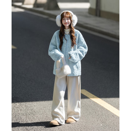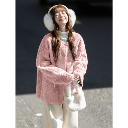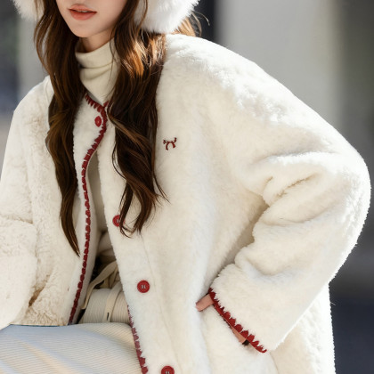 唐狮2026秋冬季仿羊羔毛外套女圆领小香风厚款外套白色温柔淑女风