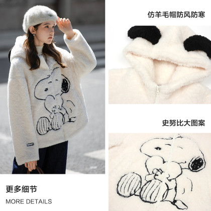 唐狮2026秋冬女史努比羔毛拼接短款羔毛外套可爱毛茸茸甜美宽松