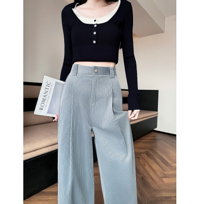 唐狮2026秋冬季女士灯芯绒长裤宽松休闲净色翻边设计感高级慵懒风