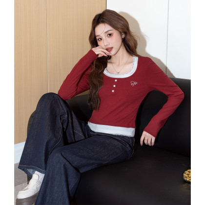 唐狮2025新款春女圆领长袖T恤假两件设计蕾丝边休闲百搭韩系潮wp