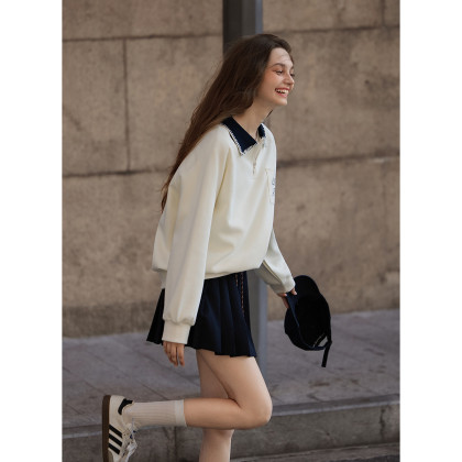 唐狮春季新款女polo短款撞色宽松显瘦长袖上衣白色爆款设计感