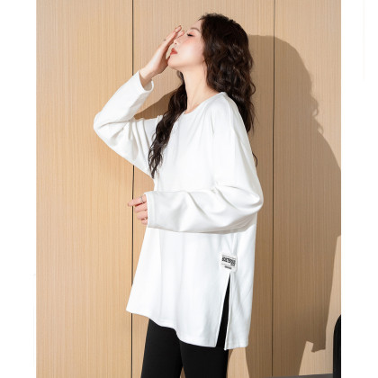 唐狮2026春秋女简约下摆开叉长袖打底衫百搭净色简约内搭高级感