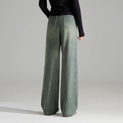 唐狮2026秋季新款女牛仔长裤复古宽松分割直筒显瘦阔腿裤k1
