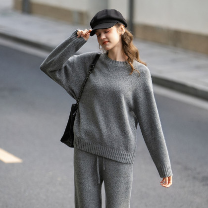 唐狮2026秋冬新款女针织圆领两件套毛衣长裤休闲套装净色时尚翻领