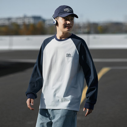唐狮春秋季新款长袖T恤男撞色拼接圆领宽松上衣插肩袖打底衫潮t