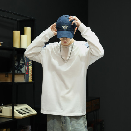 唐狮春秋季新款长袖T恤男撞色拼接圆领宽松上衣插肩袖打底衫潮t