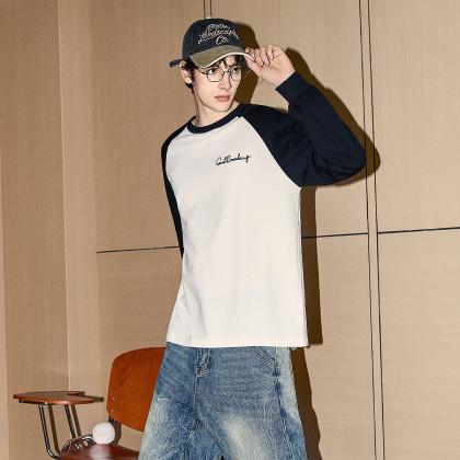 唐狮2025春秋季男款圆领长袖T恤字母发泡印撞色插肩袖设计感T恤