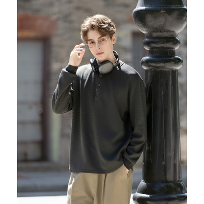 唐狮2026秋季新款长袖T恤男肌理亨利领纽扣圆领宽松上衣男内搭潮t