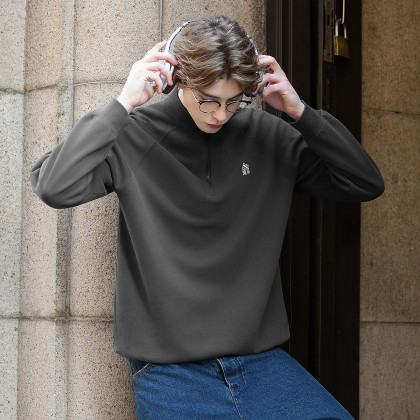 唐狮2026秋季长袖polo衫男立领精致刺绣翻领灰色拉链半开襟休闲