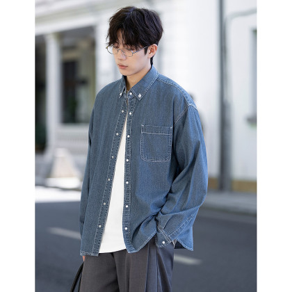 唐狮2026秋冬男士牛仔长袖衬衫钉扣领翻领外穿单口袋休闲时尚衬衫
