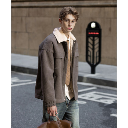 唐狮2026秋冬季外套男翻领工装口袋加厚休闲风拼接仿羊羔领外套潮