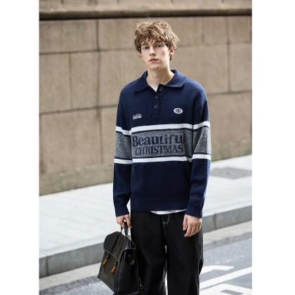 唐狮2026新款秋冬季毛衣男翻领英文拼接学院风学生美式穿搭时尚