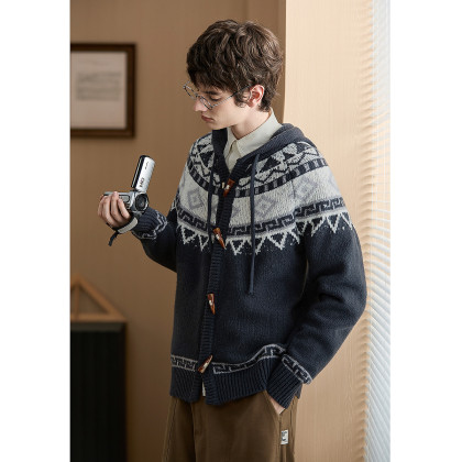 唐狮2026秋冬季男开衫毛衣连帽费尔岛设计感时尚仿牛角扣毛线衫