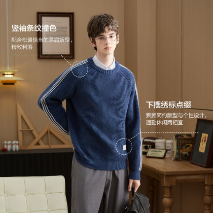 唐狮2026秋冬季毛衣男圆领套头小V撞色明线德美拉肌理感毛线衫