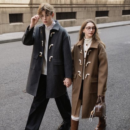 唐狮2026秋冬季中长款毛呢外套加厚情侣款翻领简约风仿牛角扣时尚