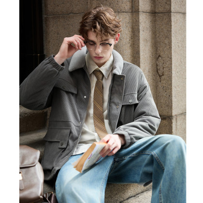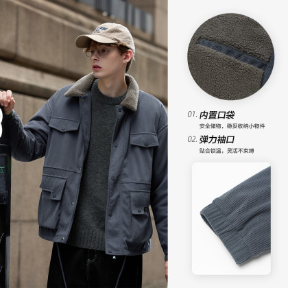 唐狮2026秋冬季加厚外套男仿羊羔毛领灯芯绒保暖休闲男士短款外套