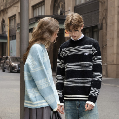 唐狮2026秋冬季情侣款毛衣圆领绣花条纹上衣休闲风超好看毛线衫