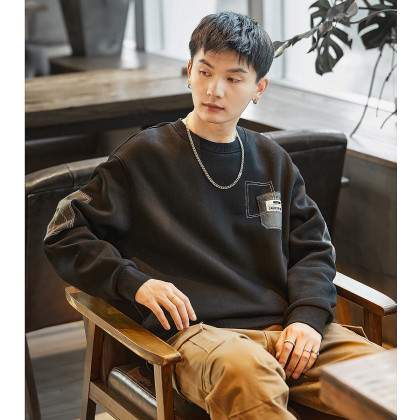 唐狮2026秋冬男圆领加绒拼接卫衣百搭设计感时尚休闲贴布宽松