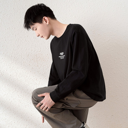 唐狮2025春款男式t恤长袖圆领左胸文字青少年运动宽松打底上衣