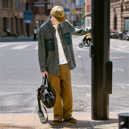 唐狮春秋季新款条纹开衫男宽松工装纯色衬衣休闲外套牛仔潮