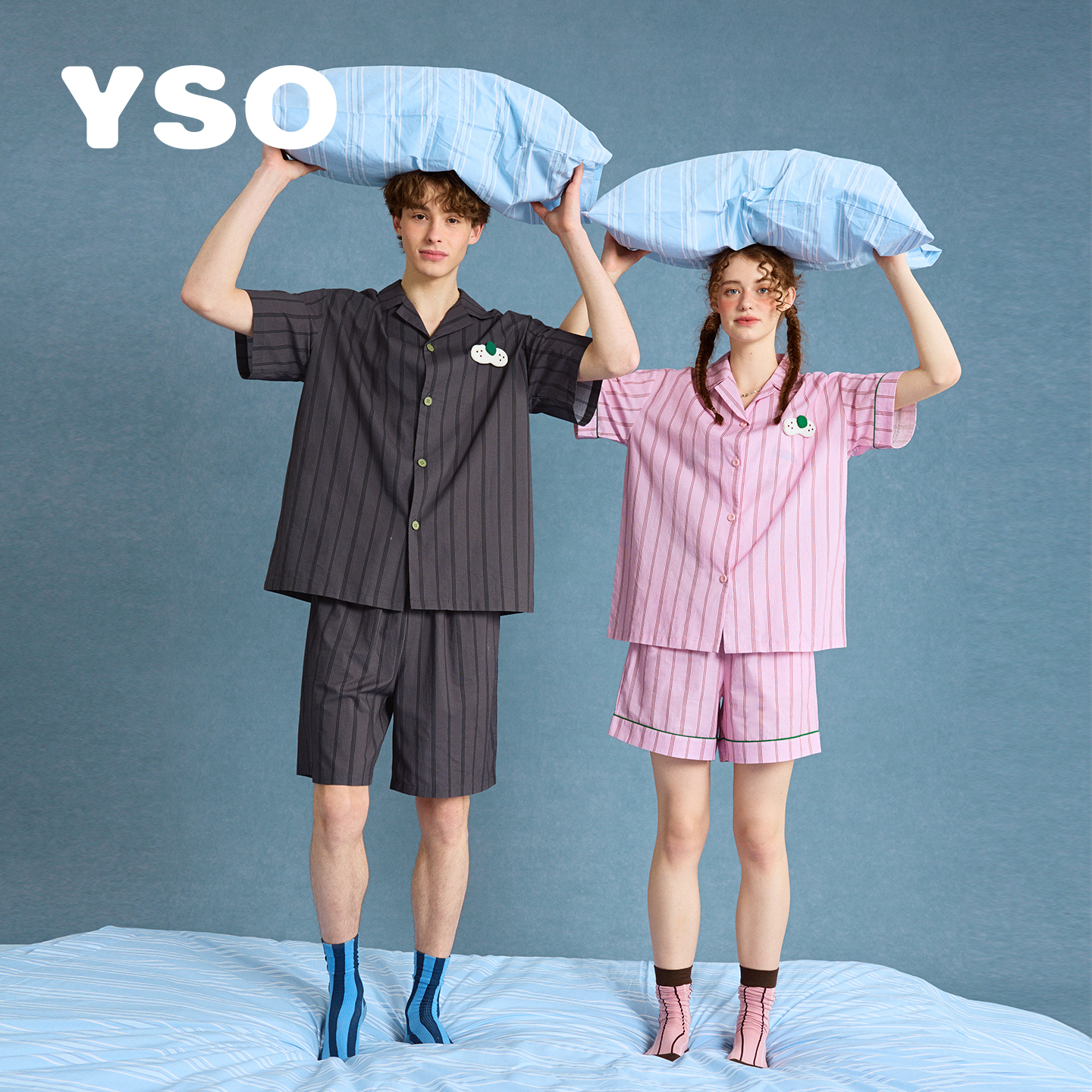 yso【酷猫系列】睡衣女夏棉情侣套装男女条纹气质休闲简约家居服B