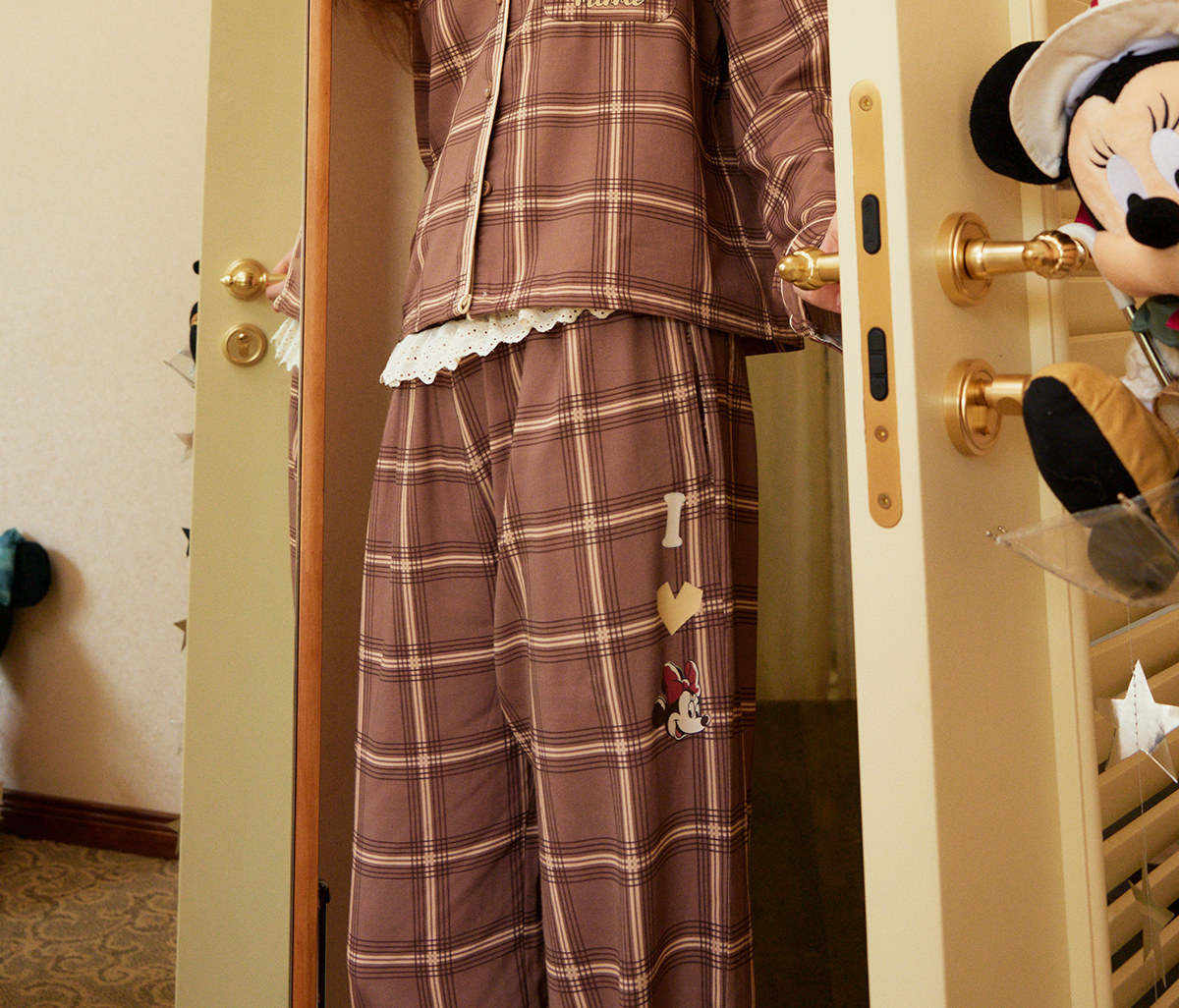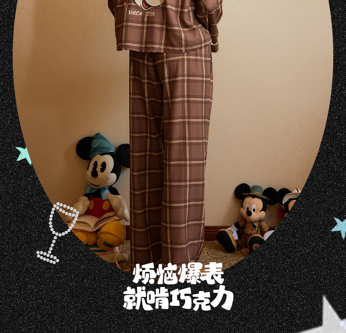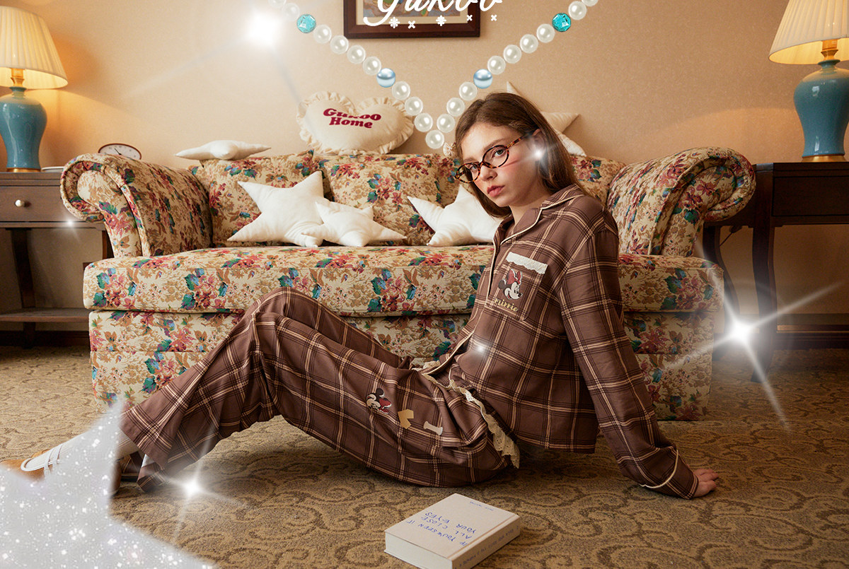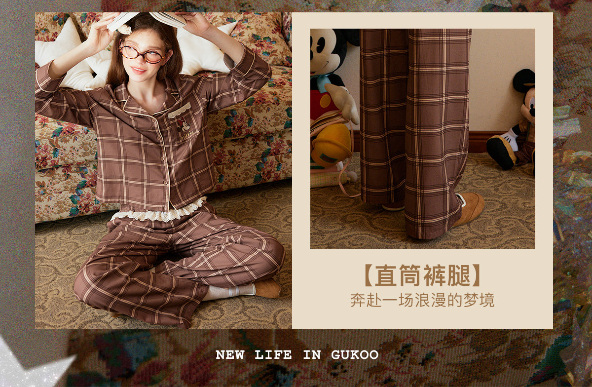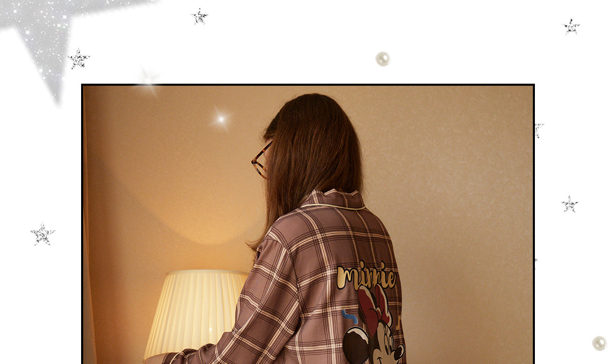 Gukoo/果壳睡衣女春秋款迪士尼联名新款格子简约女士家居服套装C