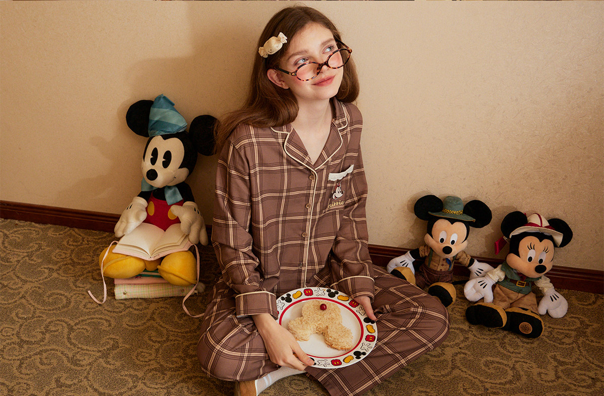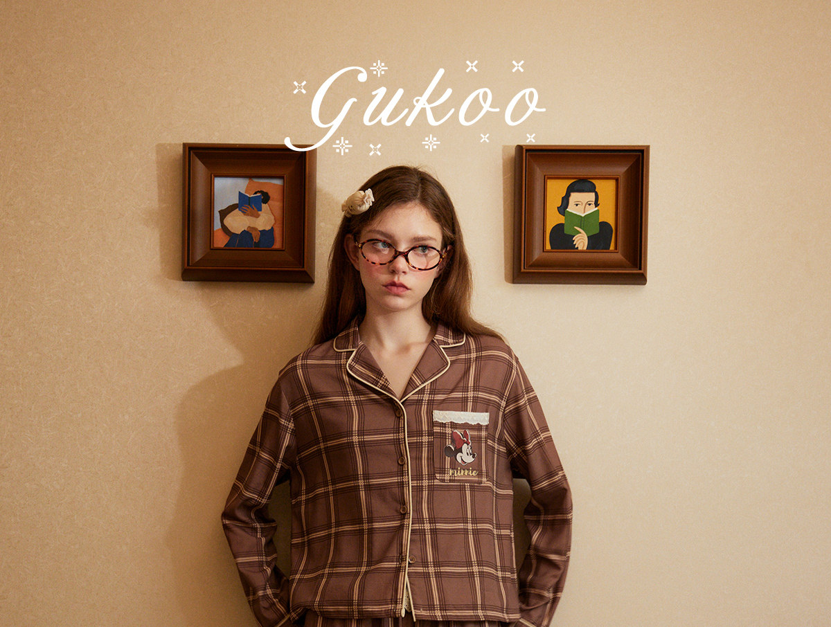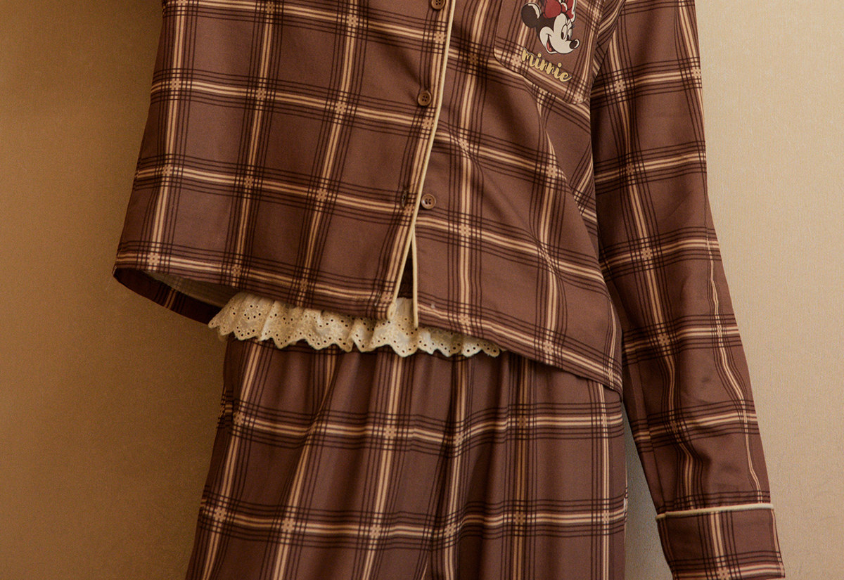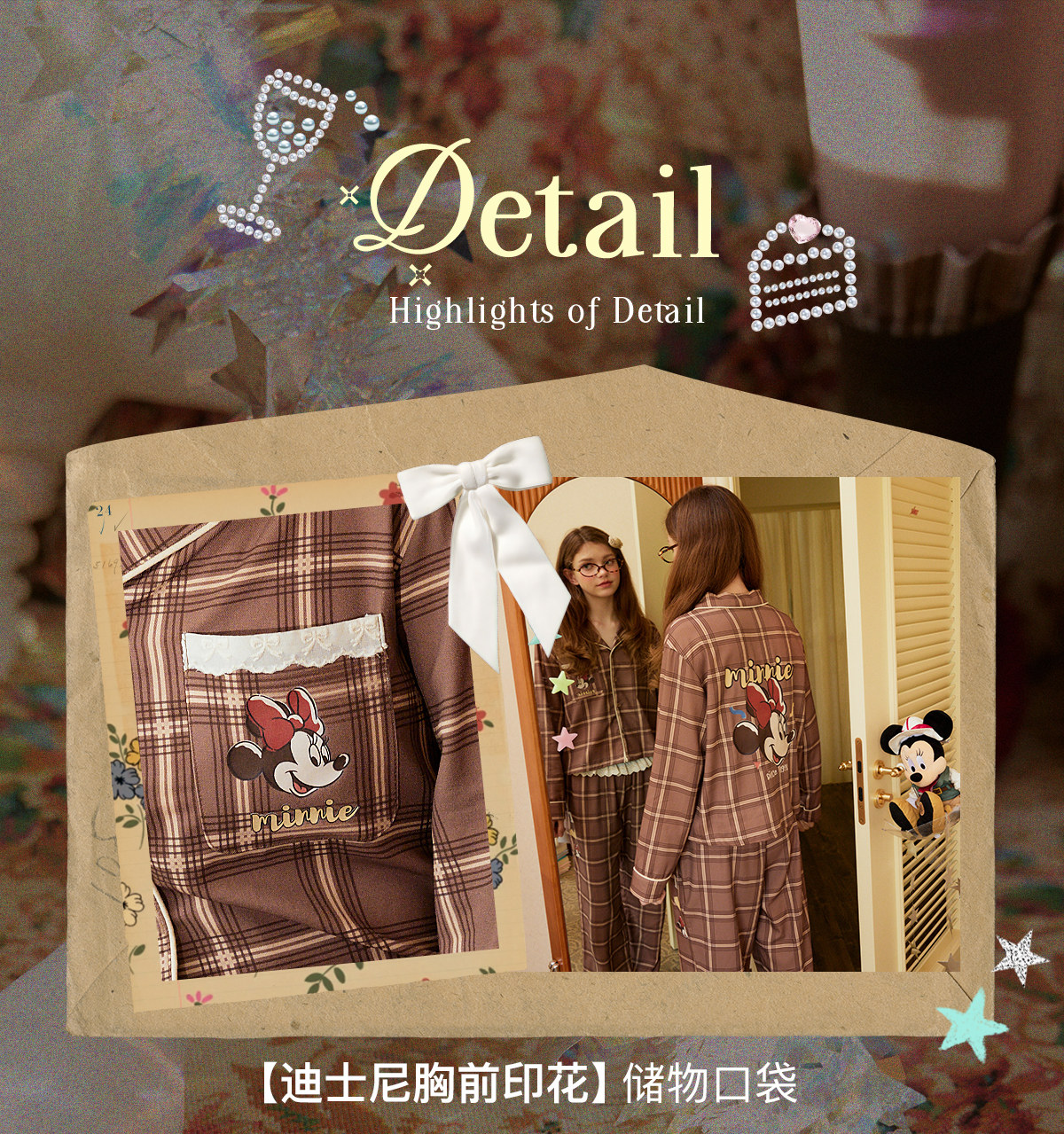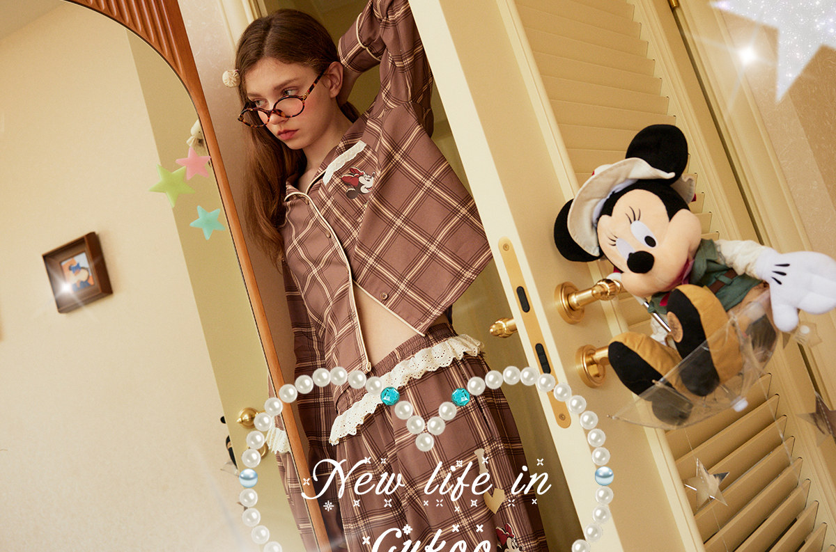 Gukoo/果壳睡衣女春秋款迪士尼联名新款格子简约女士家居服套装C