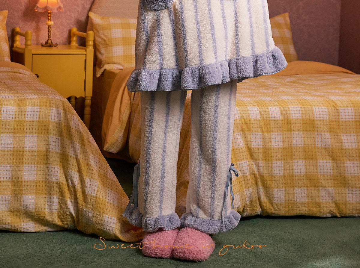 Gukoo/果壳睡衣女冬季珊瑚绒保暖新款条纹女士家居服套装D