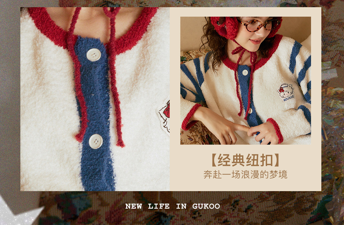 Gukoo/果壳睡衣女冬季半边绒保暖新款mikko联名女士家居服套装D