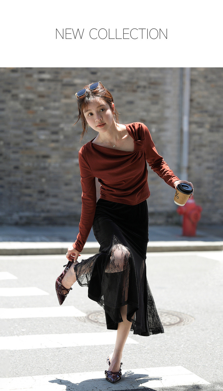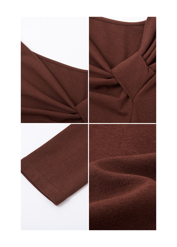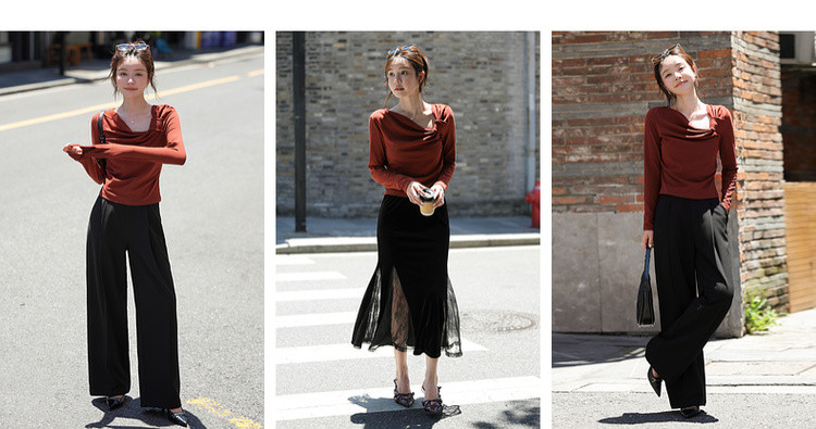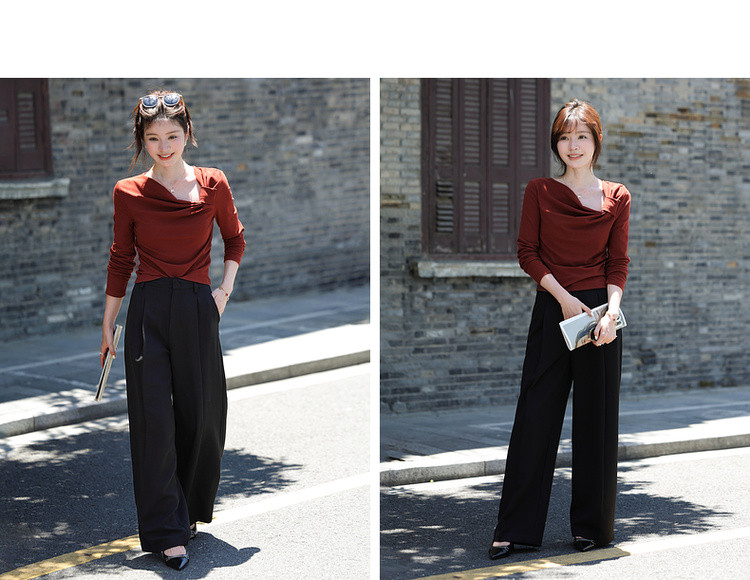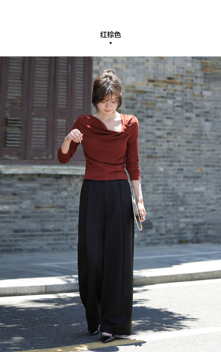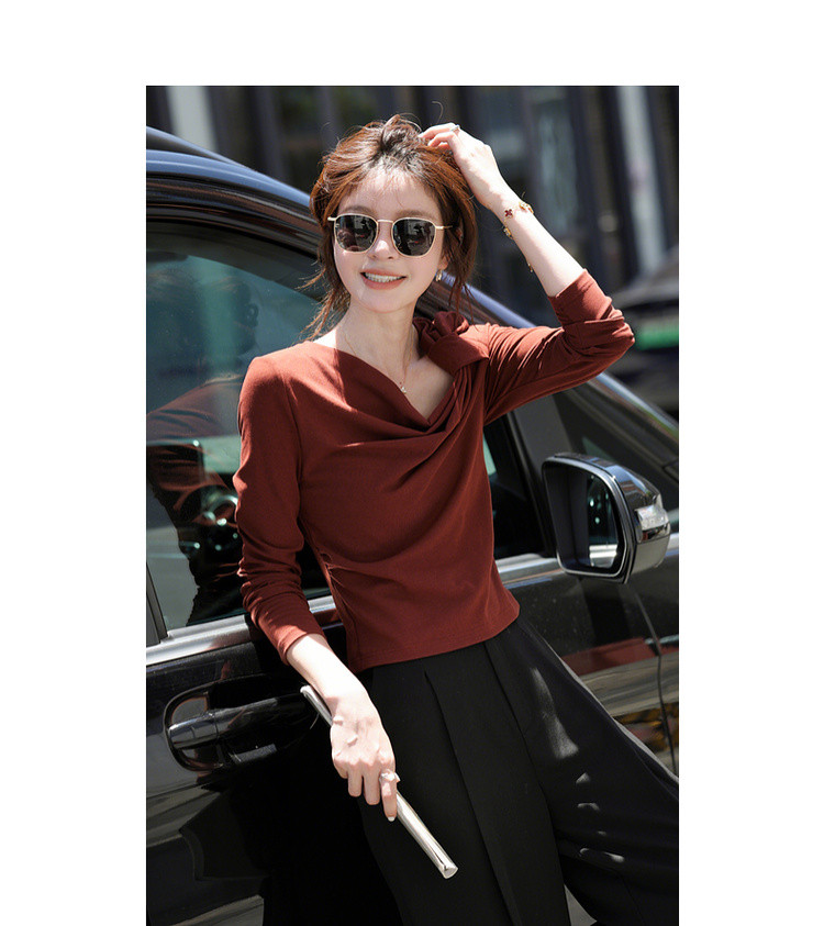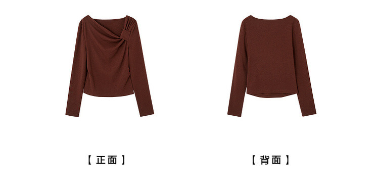 【法韵都市】秋季气质名媛不对称斜领褶皱修身云朵棉舒弹女式t恤