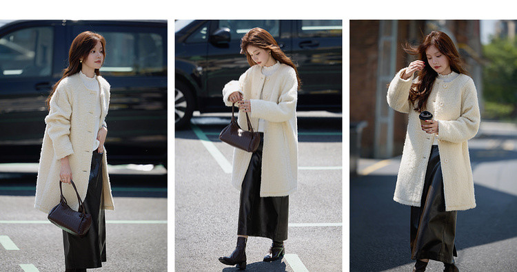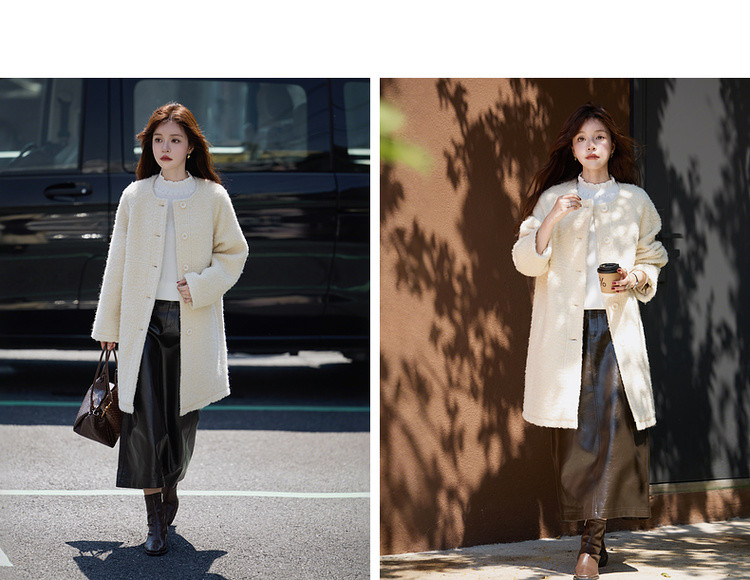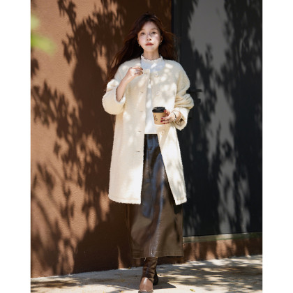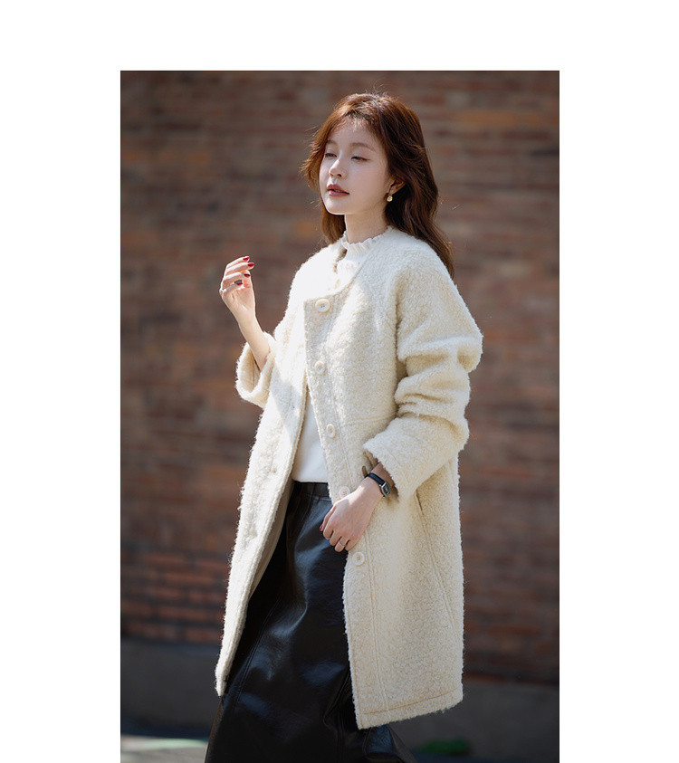 【绒冬暖境】2025冬绵羊毛圈圈呢圆领长款宽松保暖简约女式毛绒外套