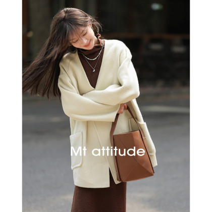 【纯色栀子花】秋季款百搭大V领极简风休闲大口袋双面呢羊毛大衣