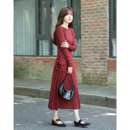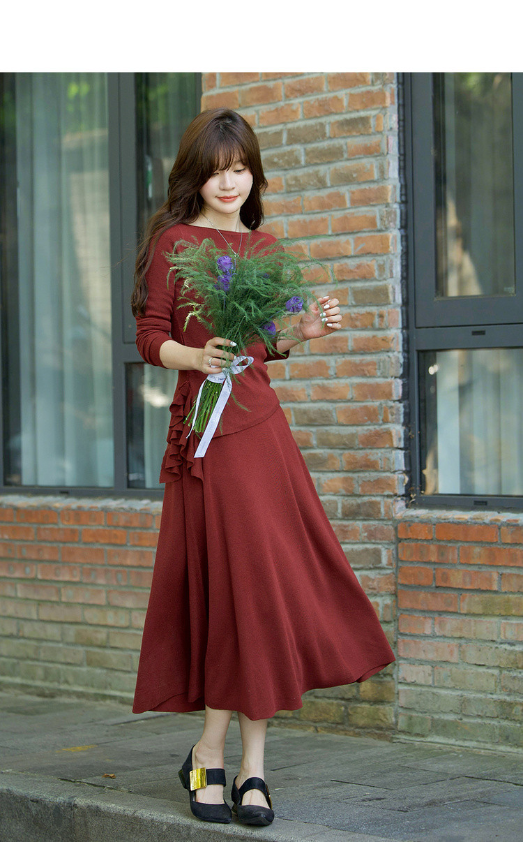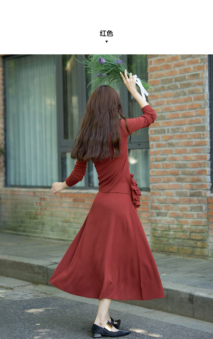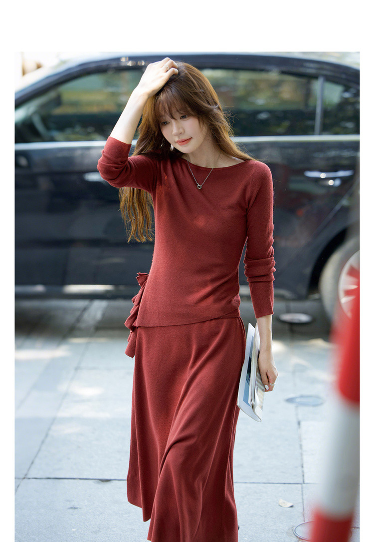 【优雅慢生活】2025冬含绵羊毛针织套装一字领上衣A字半裙女两件套