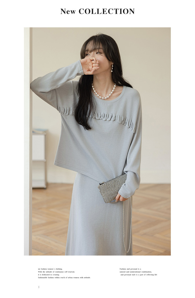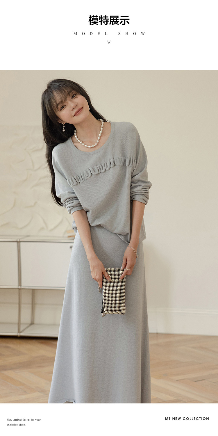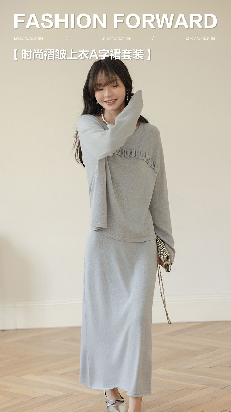【休闲舒适风】秋款褶皱设计针织上衣字针织半裙套装
