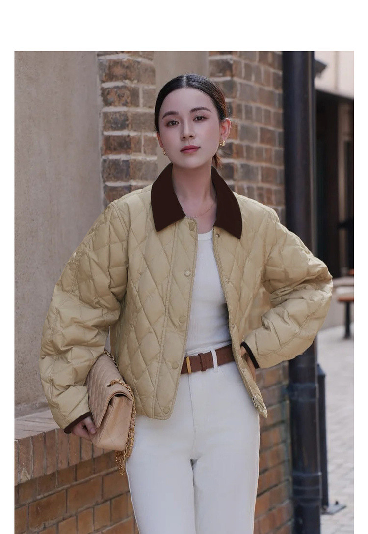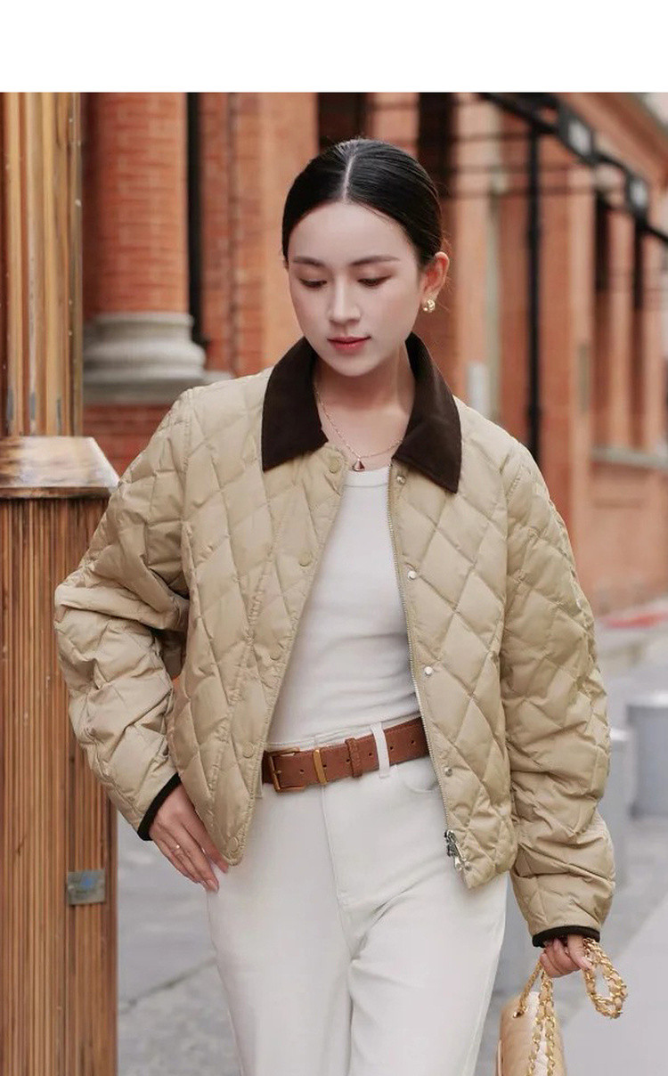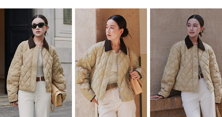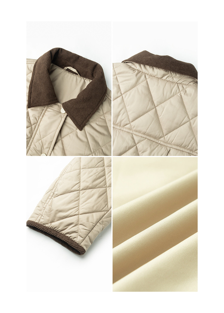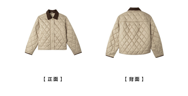 【巴恩风系列】2025冬保暖菱格绗缝棉衣拼接翻领复古小个子女式棉服