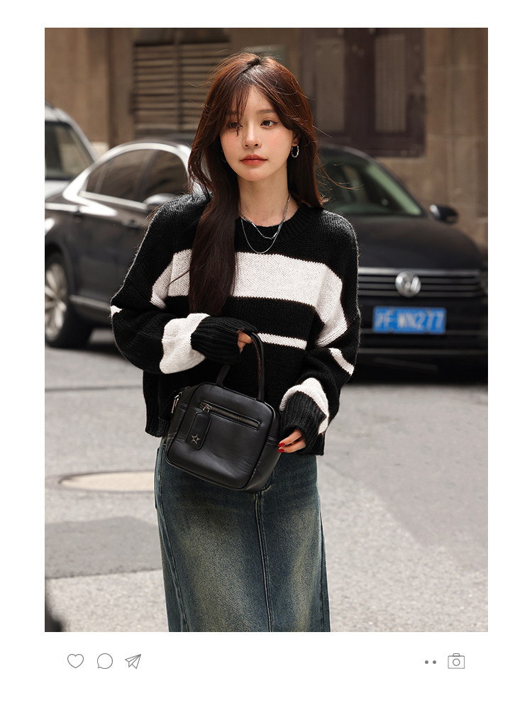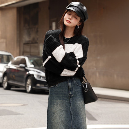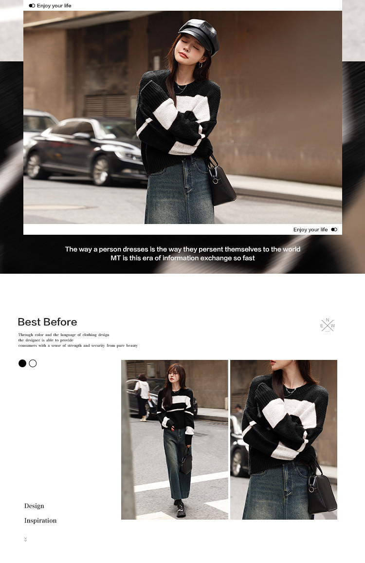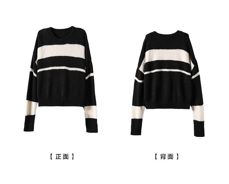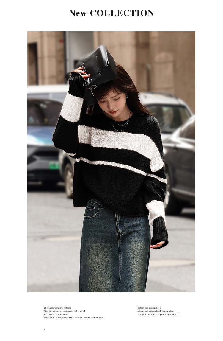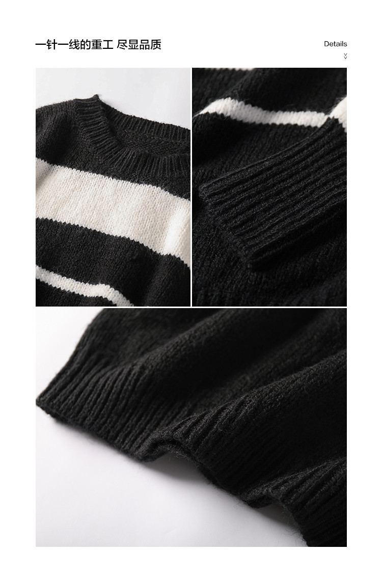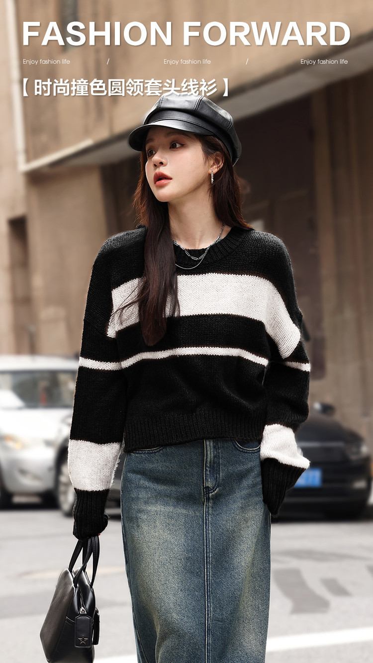 【条纹织律】冬季复古撞色条纹圆领线衫含绵羊毛舒适针织衫女上衣