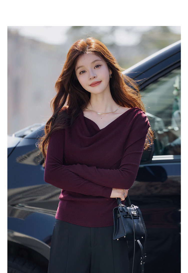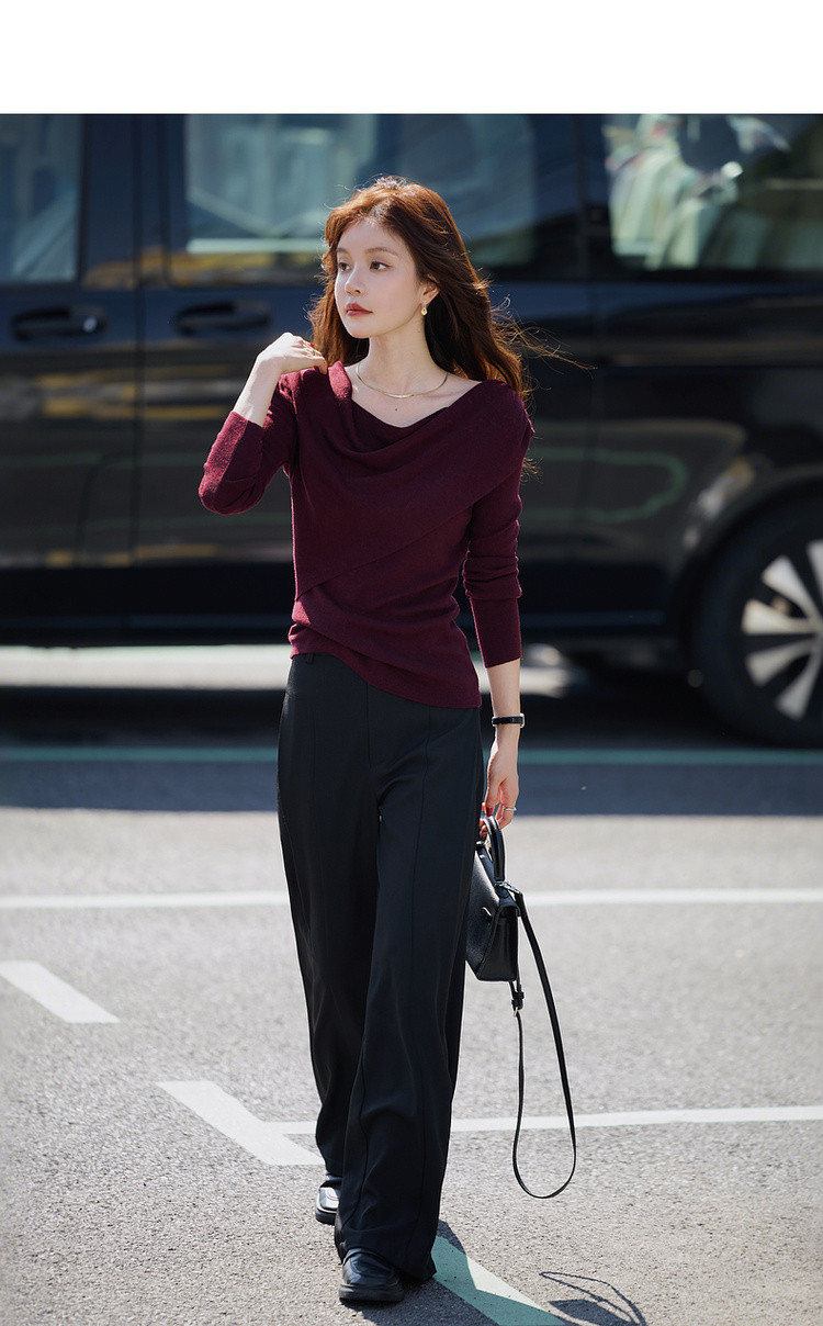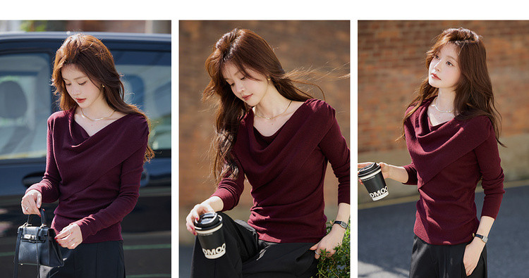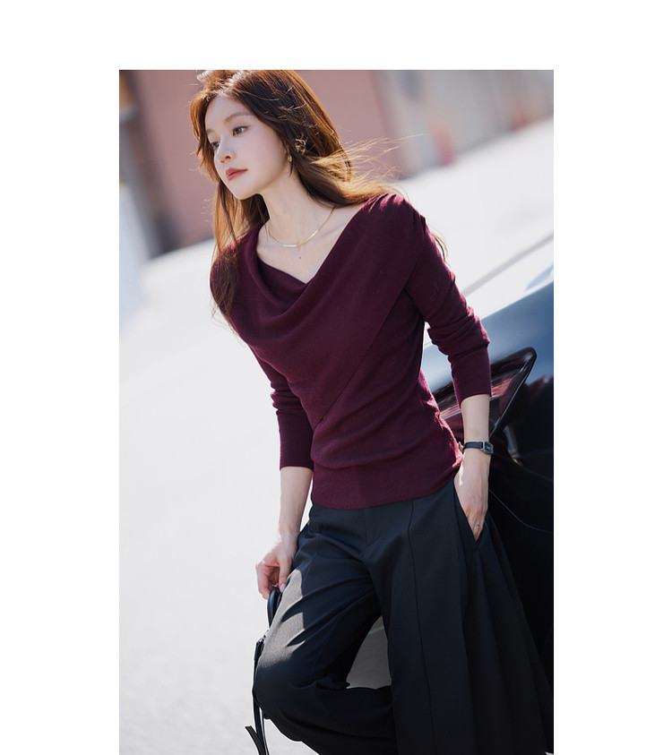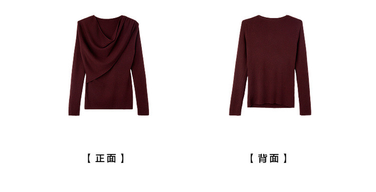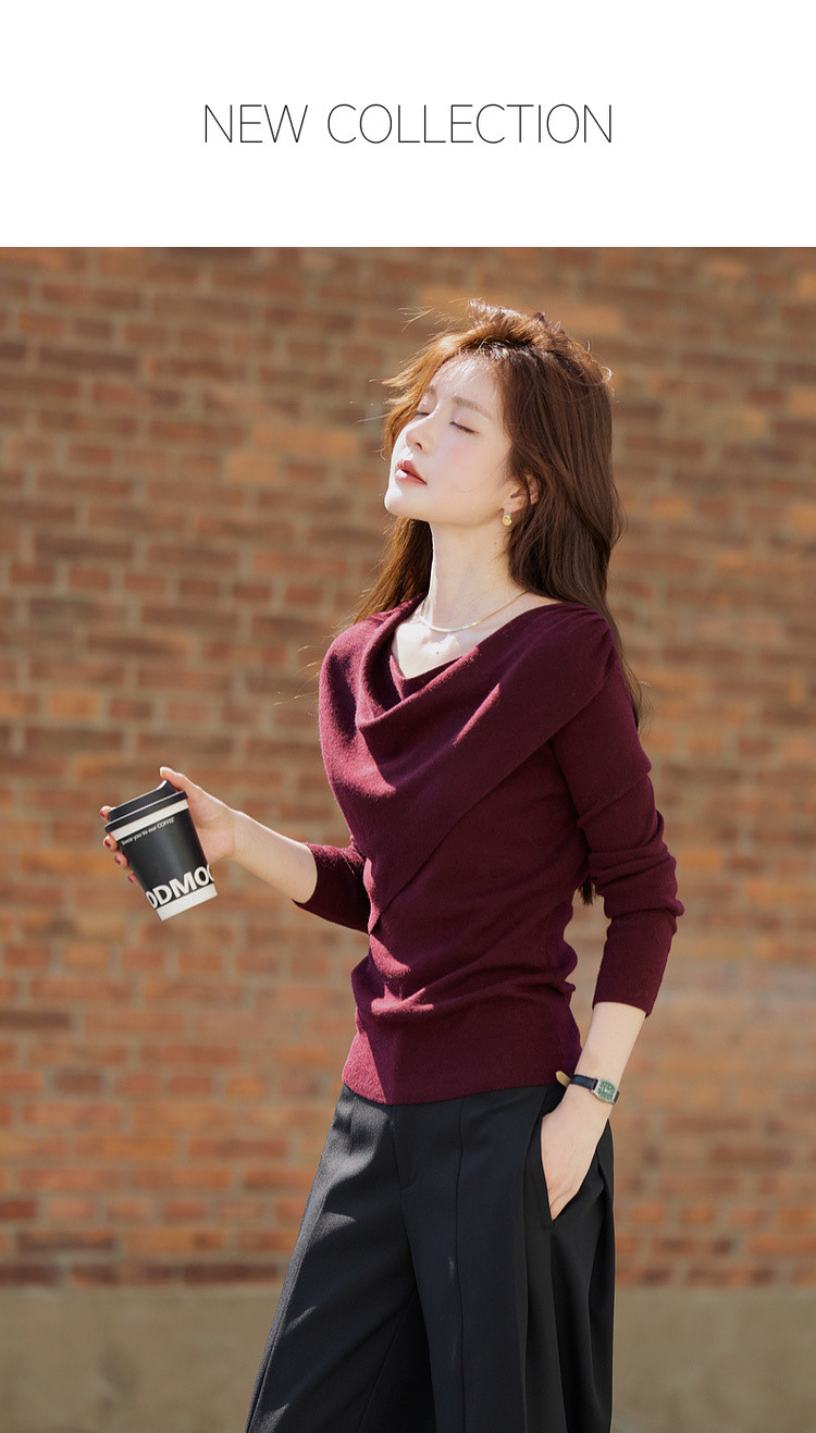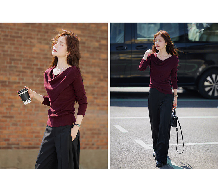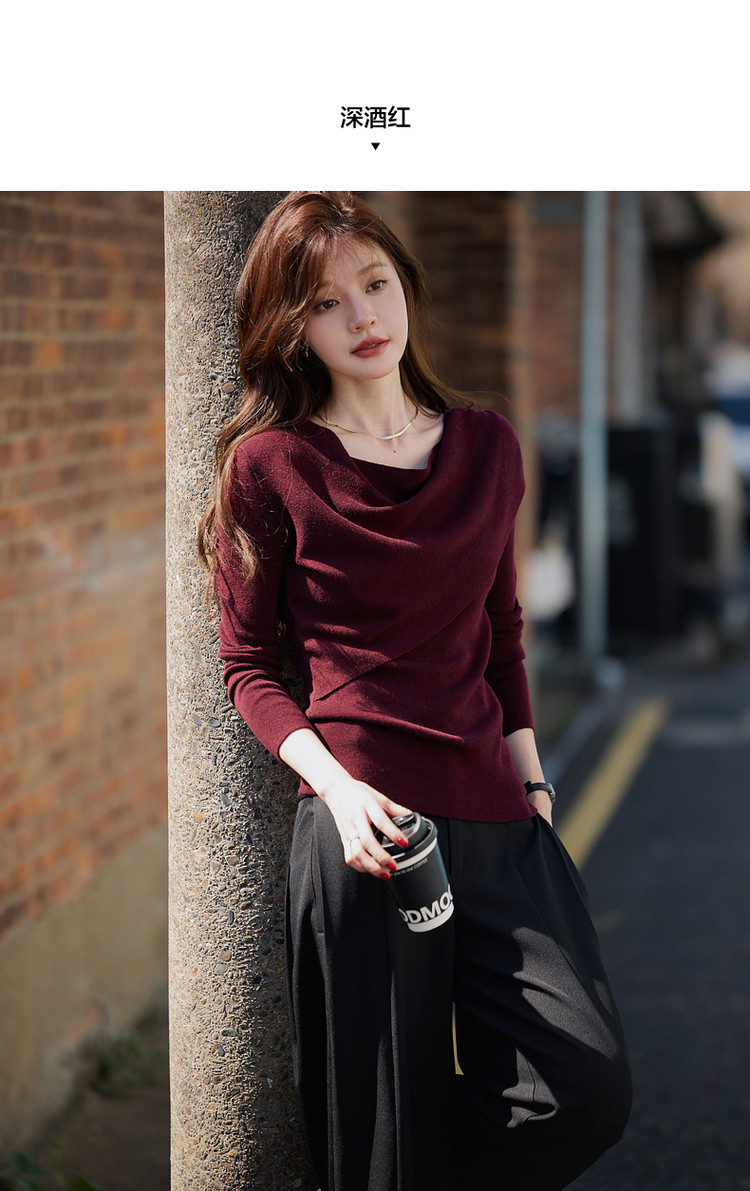 【慵懒序章】秋季法式复古褶皱荡领线衫修身含绵羊毛针织衫女上衣