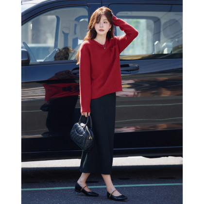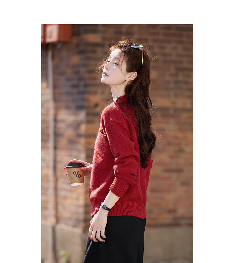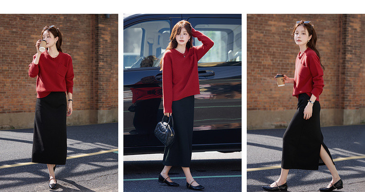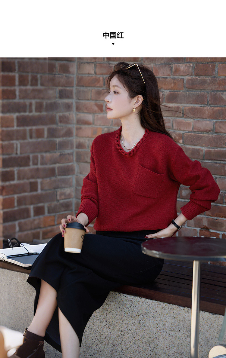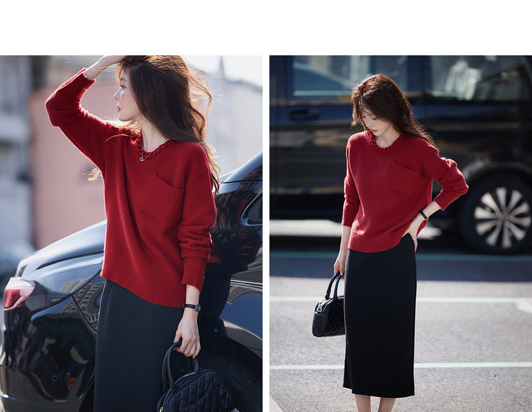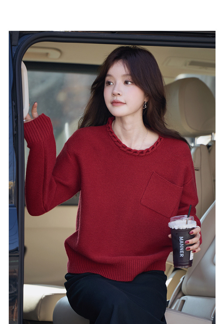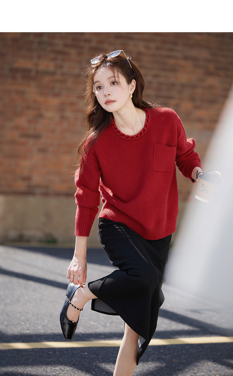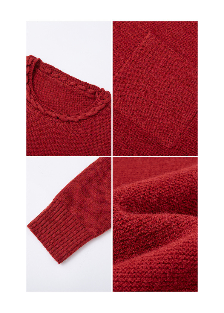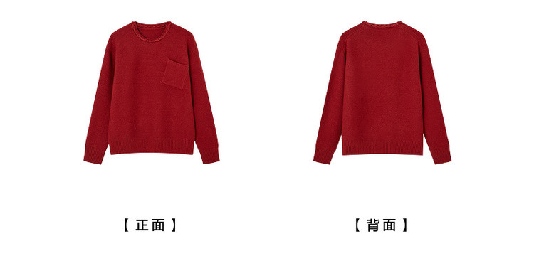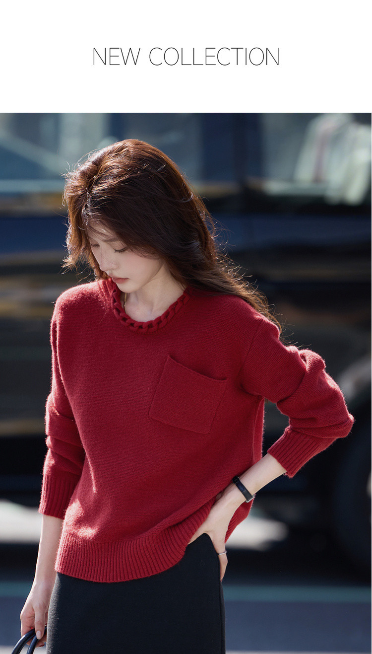 【节庆系列】2025冬优雅风绞花圆领线衫设计感贴袋简约针织衫女上衣