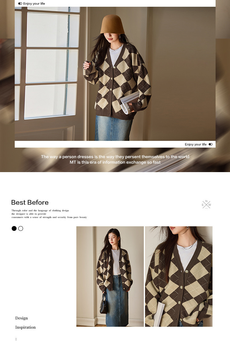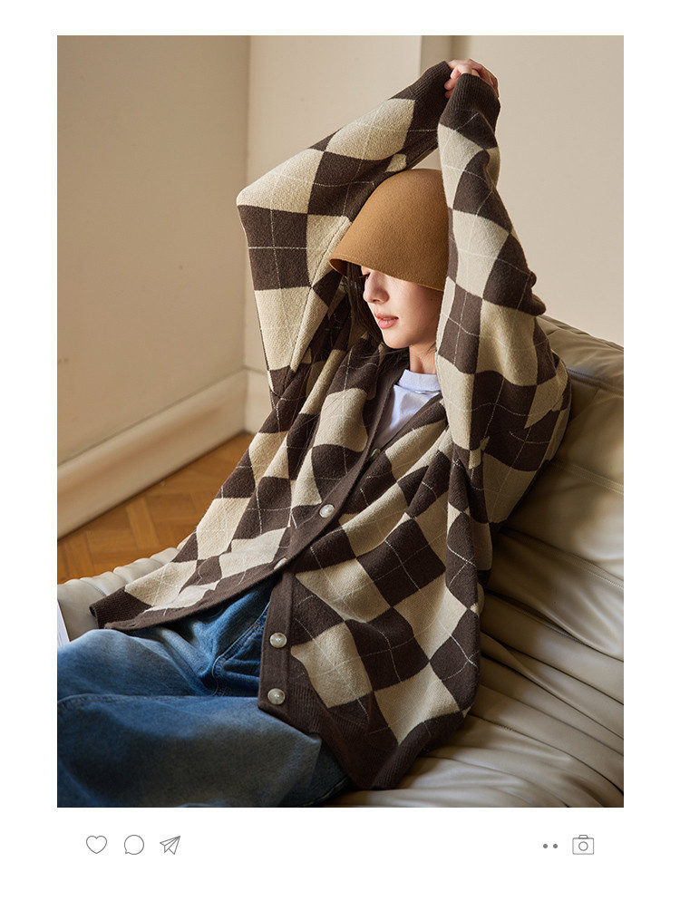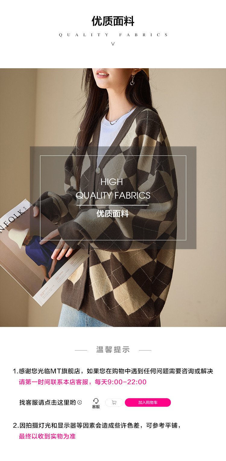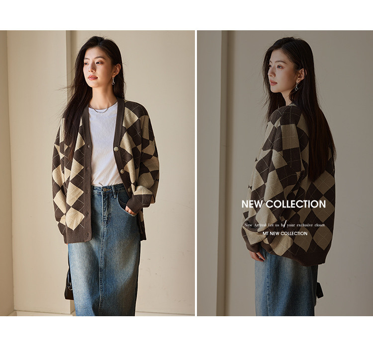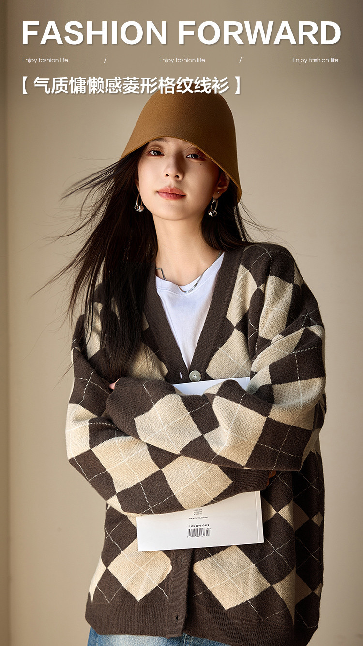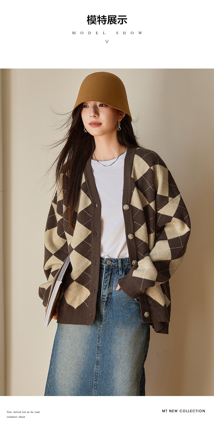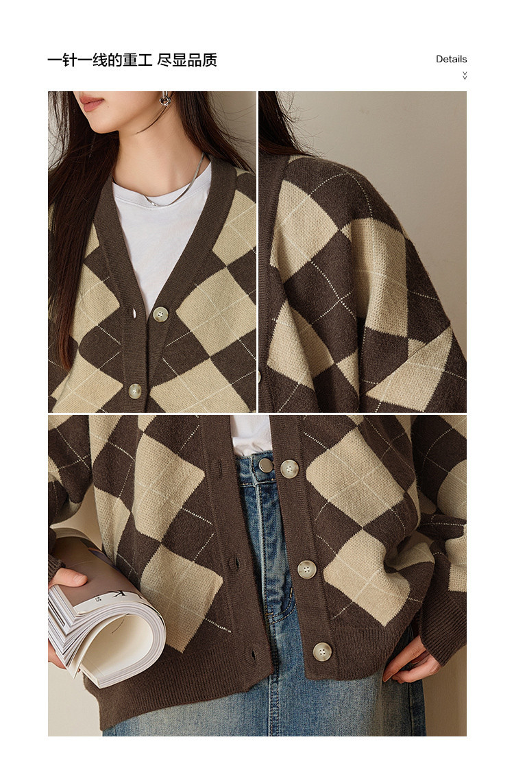 【文艺知识分子】秋季复古风菱格V领开衫慵懒风软糯针织衫女上衣