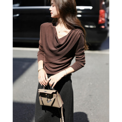 【慵懒序章】秋季法式复古褶皱荡领线衫修身含绵羊毛针织衫女上衣